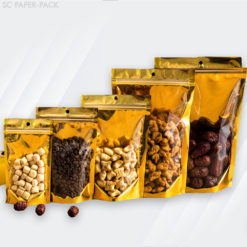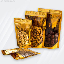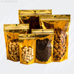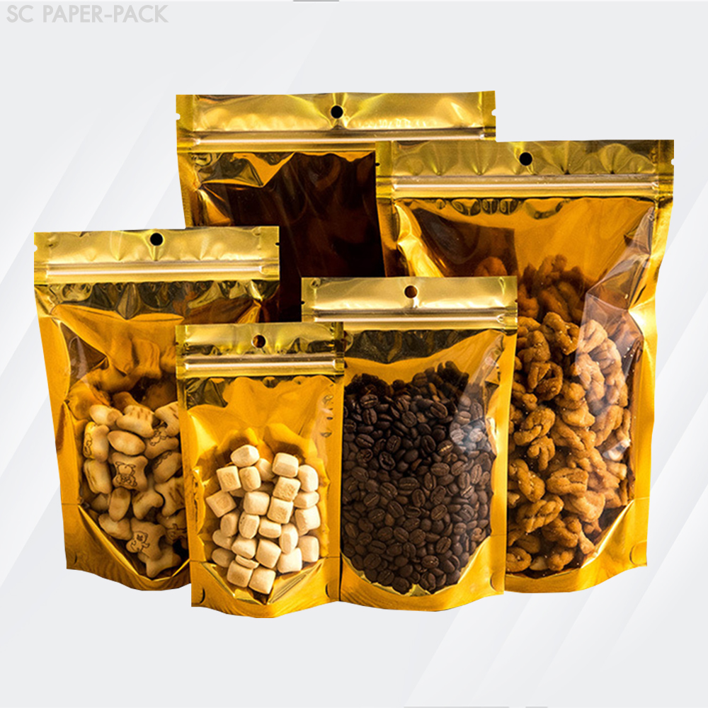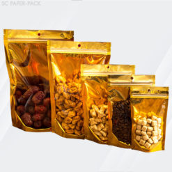 ถุงพลาสติก หน้าใส หลังทึบสีทอง เจาะรูแขวน ตั้งได้ ซิปล็อค (แพ็ค 50)