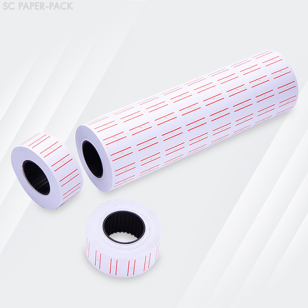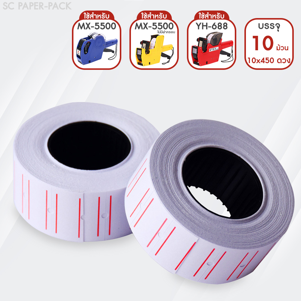 สติกเกอร์ตีราคา สีขาวคาดแดง 12X21MM สำหรับเครื่อง MX-5500 และ YH-688 (แพ็ค 10ม้วนX500ดวง)